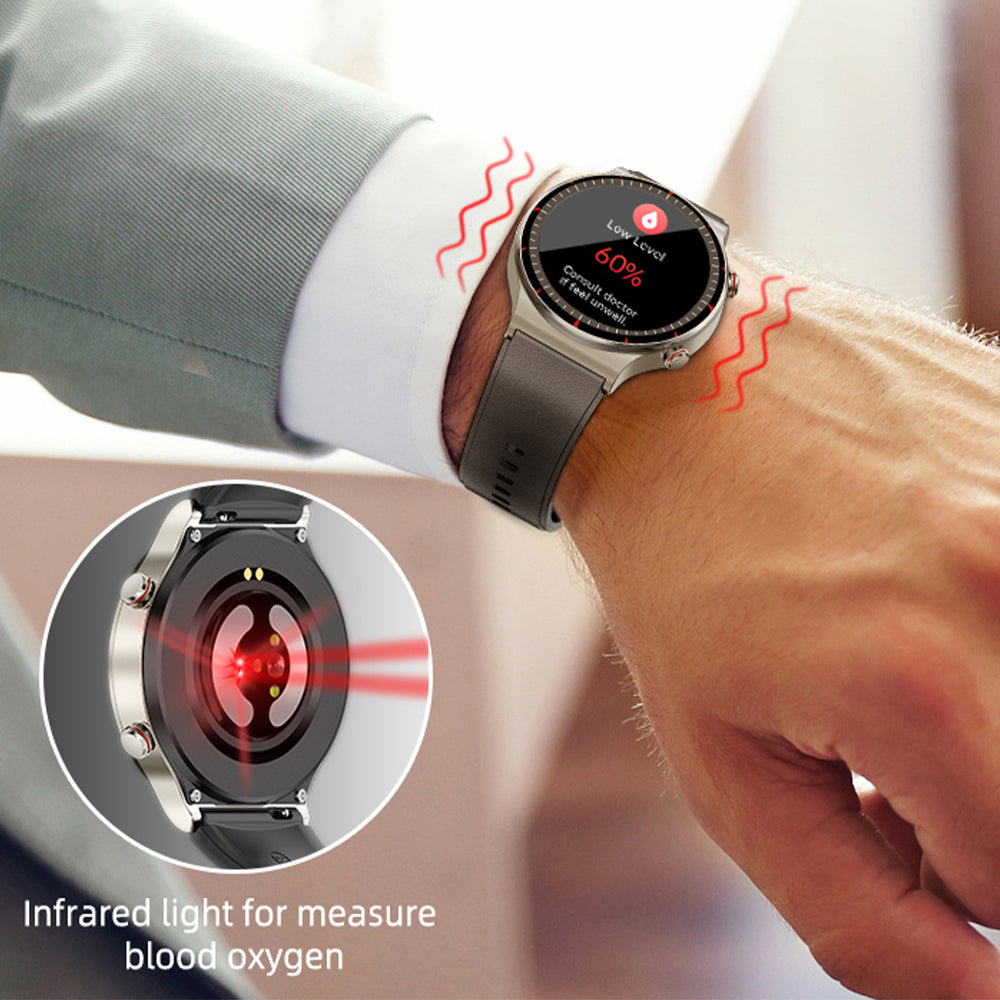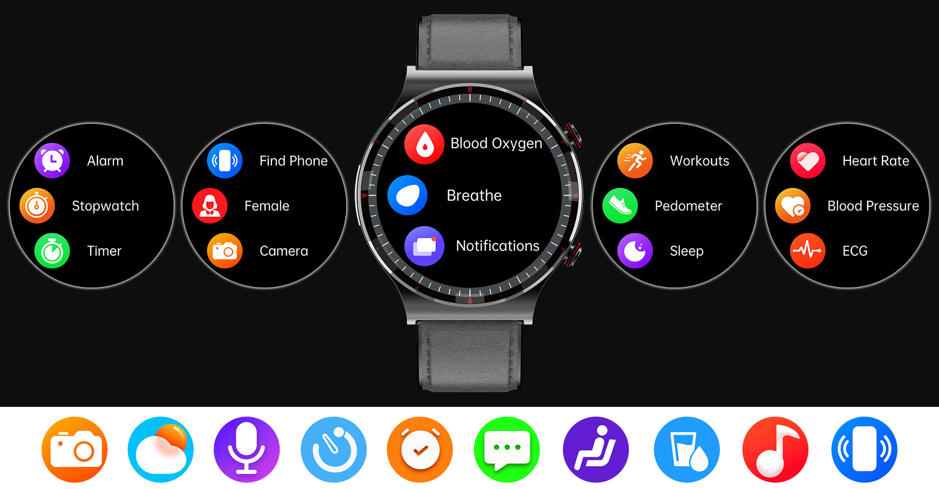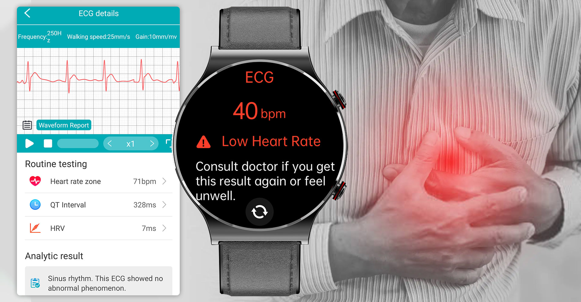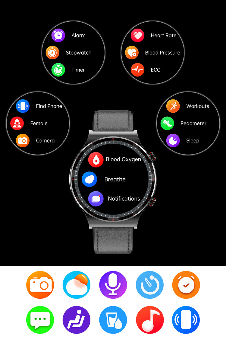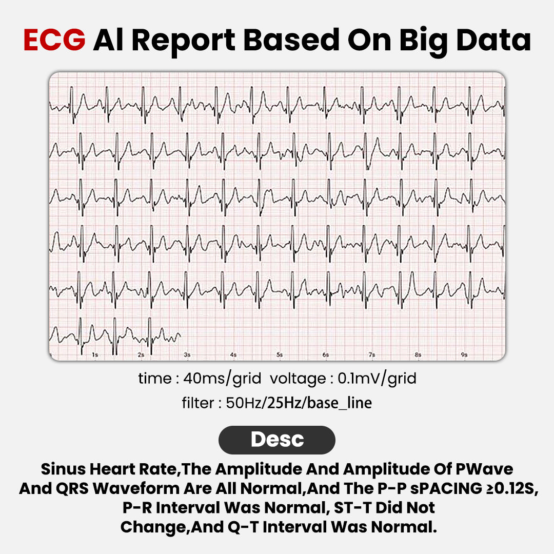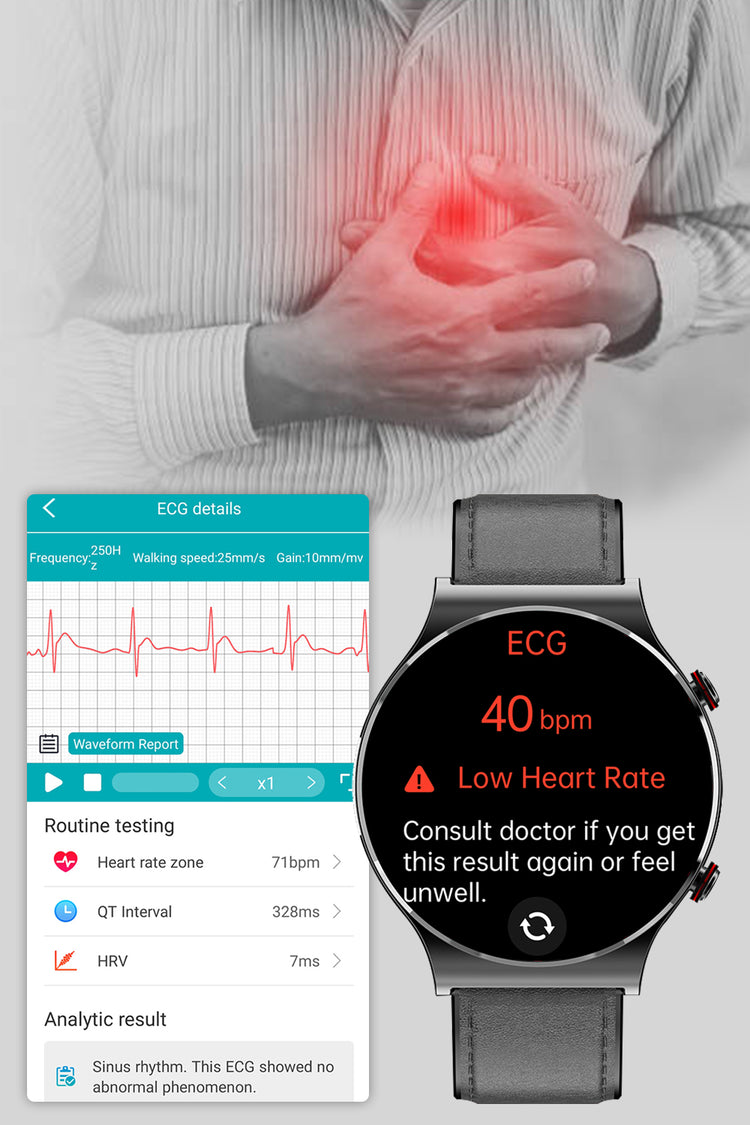 Take an ECG Anytime Anywhere,Your health partner is in your hands Built-in Maxim and OSRAM High-end ECG|SP02|HR chip, The fastest 30S to capture high-precision cardiac electrical signals; 512Hz ECG sampling frequency, Acquisition of I-lead ECG signal. If there is any heart discomfort, activate the emergency mode, Quickly capture and store abnormal ECG signals, view the report through the APP, and export the ECG for sharing. Osram sensors