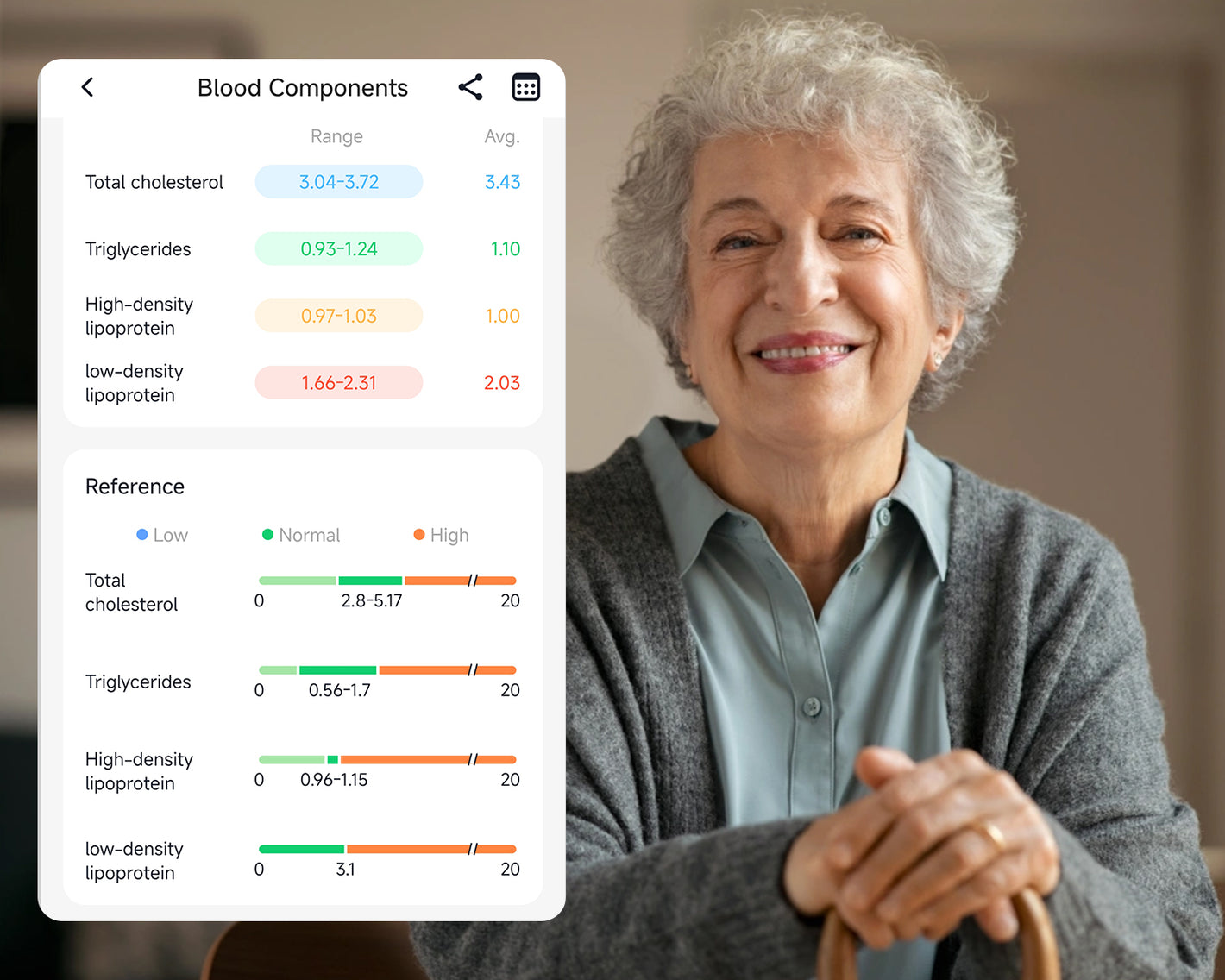 Blood components, uric acid, total cholesterol, triglycerides, high-densitylipoprotein and low-density lipoprotein, are measured and analyzedto help you know the health status of blood components at all timesand set up a private mode to obtain more accurate health data.