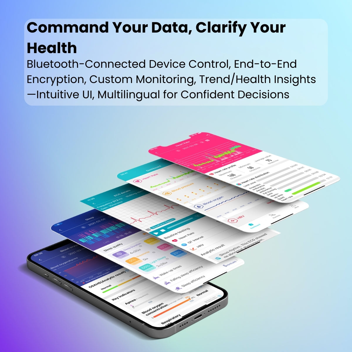 Bluetooth-Connected Device Control, End-to-EndEncryption, Custom Monitoring, Trend/Health InsightsIntuitive Ul, Multilingual for Confident Decisions